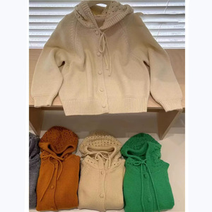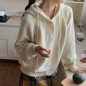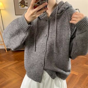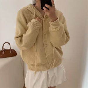 韩版镂空帽子包扣设计感针织开衫女早秋新款宽松纯色毛衣外套女潮