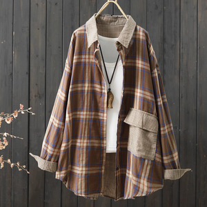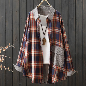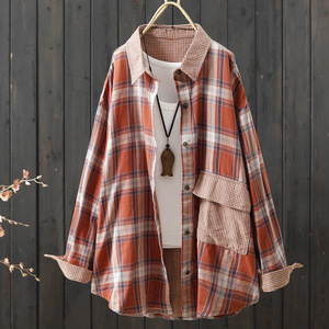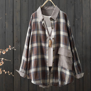 棉纱宽松大码女装中长款格子衬衫女长袖双层沙软糯衬衣开衫薄外套
