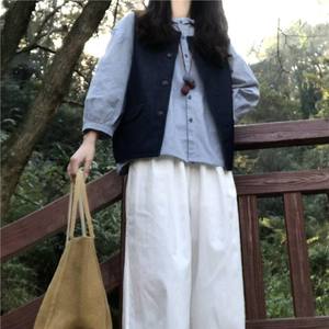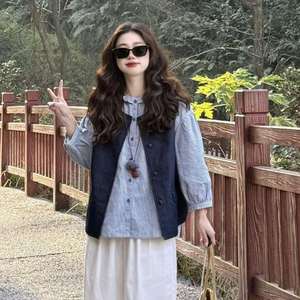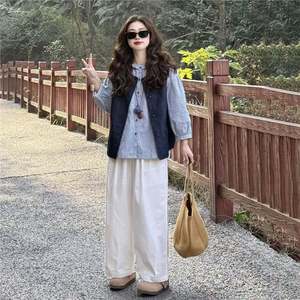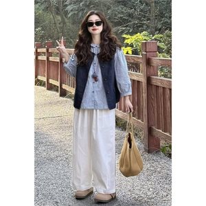 日系学院风简约条纹牛仔马甲搭配木耳花边格纹衬衫白裤子三件套装