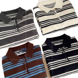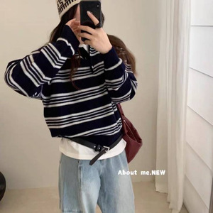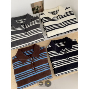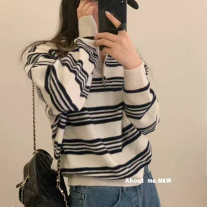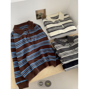 复古条纹polo翻领半扣针织衫上衣女秋冬新款宽松显瘦百搭韩系毛衣