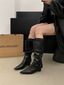 2025新款秋冬瘦腿褶皱堆堆靴绒面蕾丝长靴子女高跟坡跟尖头骑士靴