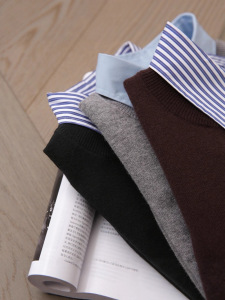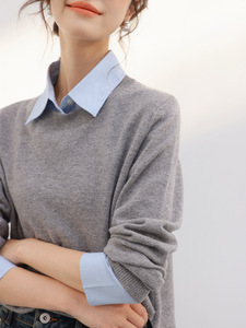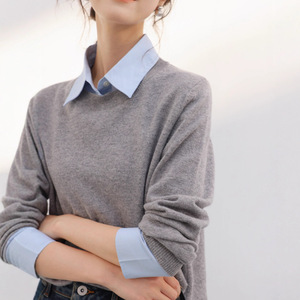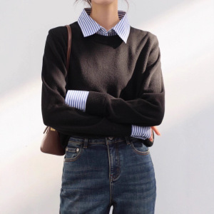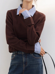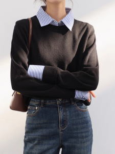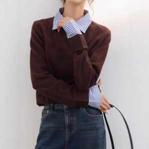 高智感时髦知识分子风假两件衬衫领拼接毛衣休闲翻领通勤针织衫