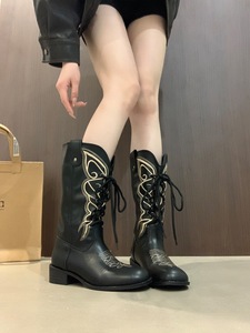 粗跟复古骑士靴西部牛仔靴女鞋2025年秋冬新款交叉系带马丁靴长靴