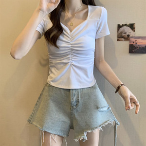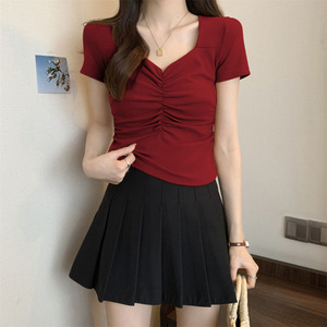 辣妹正肩短袖t恤夏季紧身方领短款修身女高腰露脐褶皱大领口上衣t
