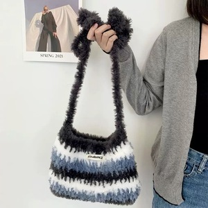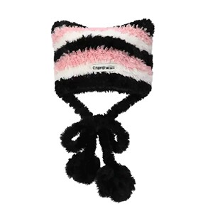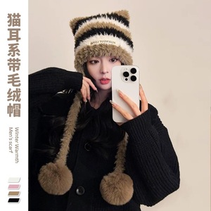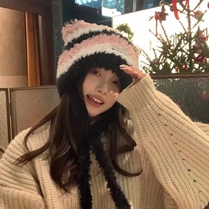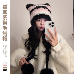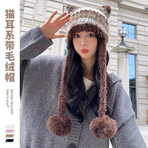 毛绒帽子女猫耳朵护耳帽秋冬季加厚保暖可爱大头围条纹针织毛线帽