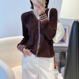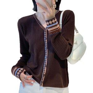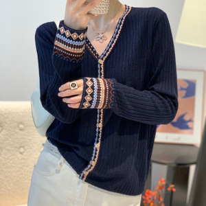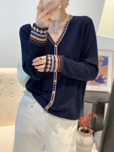 女式V字领精纺羊毛衫针织外套时尚穿搭民族风打底衫拼色条纹提花