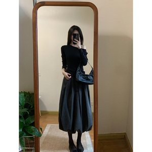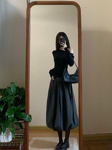 实拍~秋季纯欲设计感斜肩修身长袖上衣+高腰蓬蓬花苞裙半身裙套装