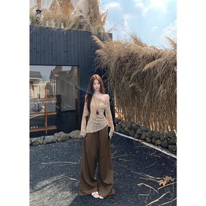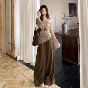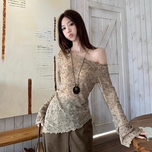 不规则复古晕染斜肩长袖针织T恤女秋季喇叭袖修身打底衫显瘦上衣