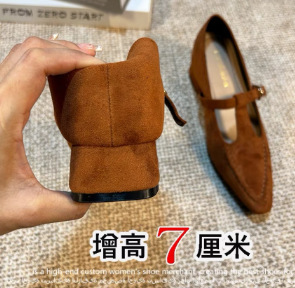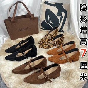 2025春秋豹纹镂空浅口百搭新款7CM内增高绒面一字带女小方头单鞋