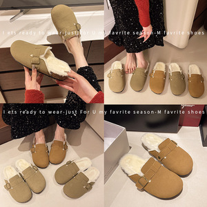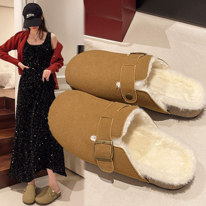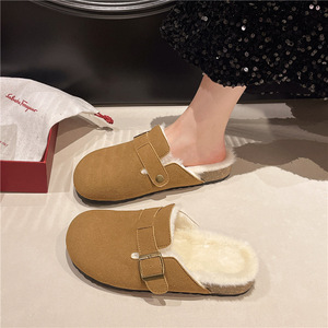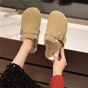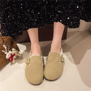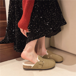 韩版包头半拖鞋大码厚底勃肯鞋2025新款外穿懒人百搭纯色毛毛鞋子