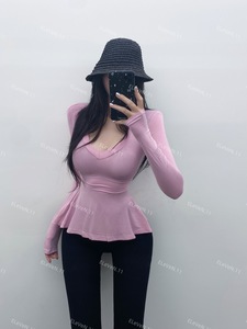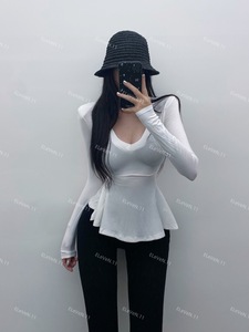 基本模型是惊人的!显瘦版~掐腰V领设计右肩长袖t恤配底裤衬衫