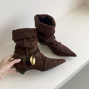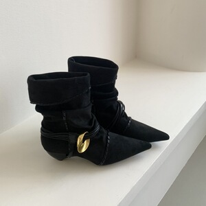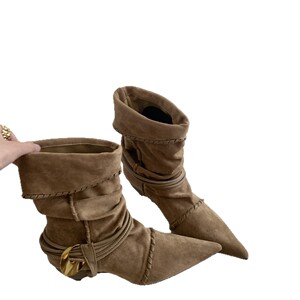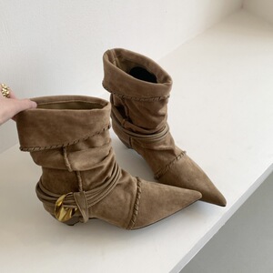 小猫跟尖头褶皱绑带堆堆靴2025新款复古绒面翻边金属扣带时装短靴