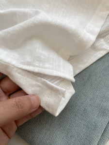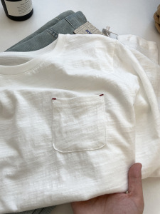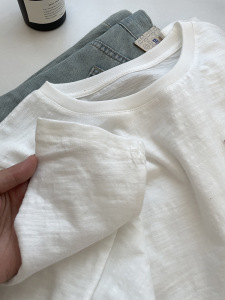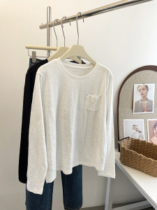 全棉开叉简约口袋圆领竹节棉长袖T恤女秋宽松显瘦百搭白色打底衫