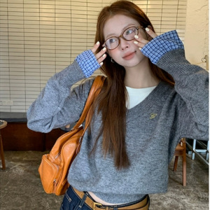 学院风袖口拼接假两件针织衫女秋冬季设计感小众宽松休闲长袖毛衣