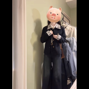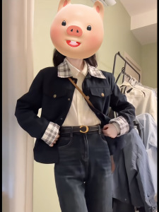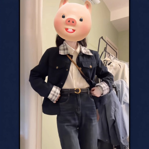 韩系复古格纹拼接翻领短款夹克女早秋新款小个子气质休闲外套批发