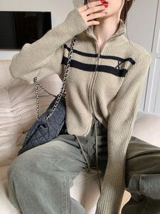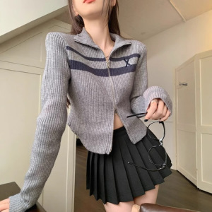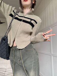设计感复古撞色双拉链POLO领针织衫女秋冬季休闲显短款瘦毛衣开衫