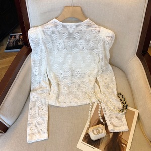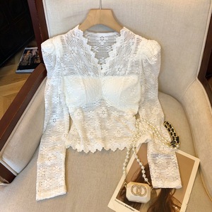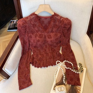 实拍~纯欲v领提花喇叭袖蕾丝衫女秋季垫肩打底衫辣妹带胸垫上衣