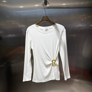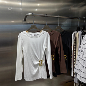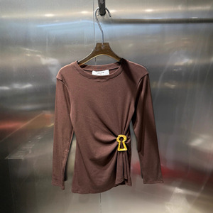 25秋季新款金属扣T恤简约上衣修身款不规则侧扣褶皱圆领长袖