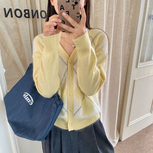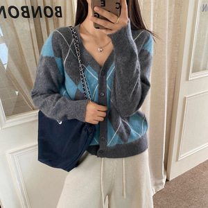 100纯羊毛衫女式V字领针织开衫拉毛工艺菱形格提花长袖毛衣外套潮