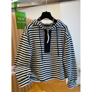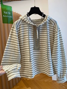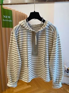 外贸240斤韩系连帽半拉链条纹t恤女装长袖宽松休闲针织衫卫衣上衣