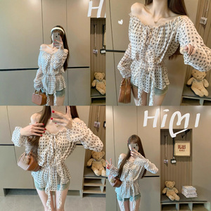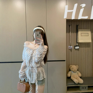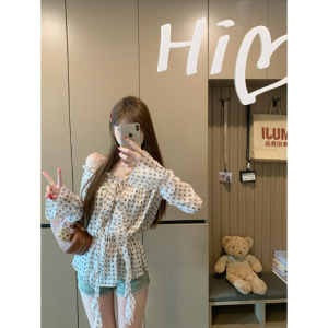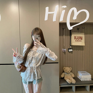 一字肩系带波点雪纺衬衫女设计感小众秋季巨好看绝美上衣法式衬衣