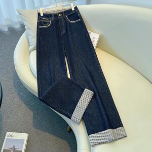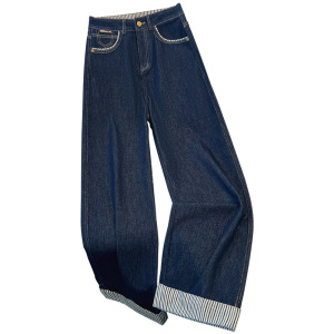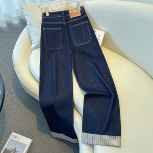 丹宁蓝直筒裤牛仔裤女秋季2025新款设计感拼接条纹显瘦拖地阔腿裤
