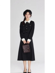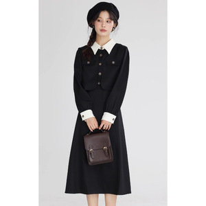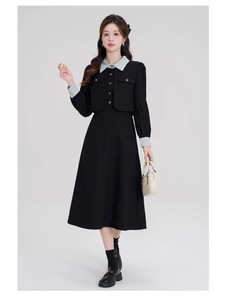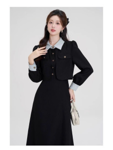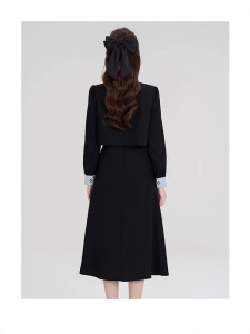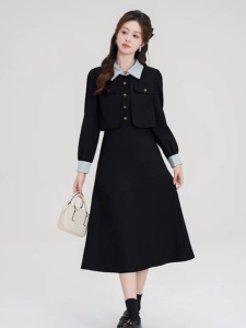 法式假两件气质高级感黑色长袖大码胖mm2025秋冬女装收腰连衣裙