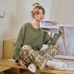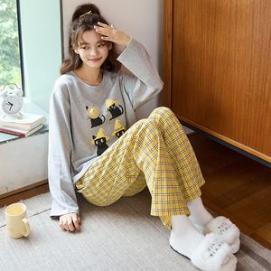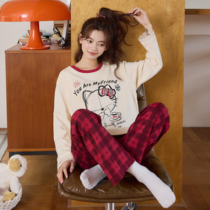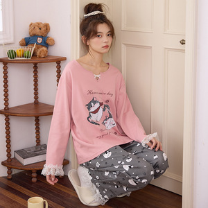 纯棉睡衣女款2025新款长袖长裤爽棉卡通可爱猫咪家居服套装带胸垫