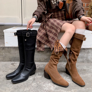 两穿可翻折皮带扣牛皮骑士靴2025秋冬粗跟高跟方头真皮高筒长靴女