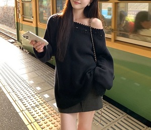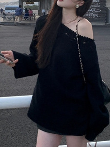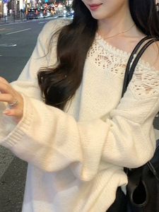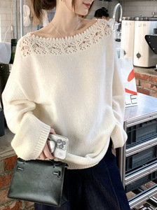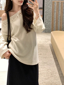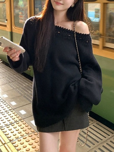 美利奴羊毛镂空花边一字领针织衫女秋长袖宽松慵懒上衣