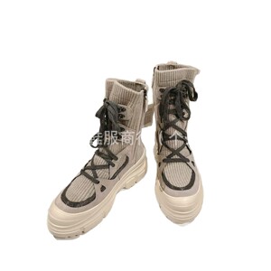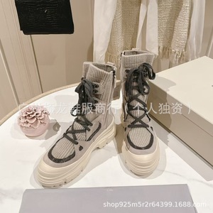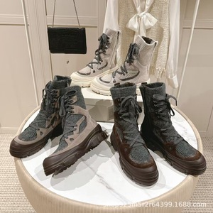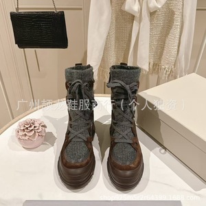 高端2025秋冬麂皮真皮圆头拼色复古厚底绑带针织弹力短靴马丁靴女
