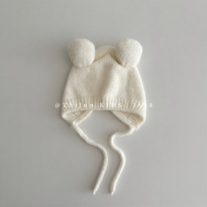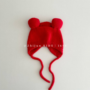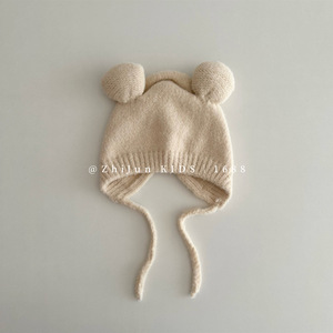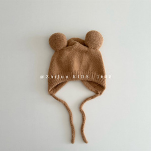 冬季宝宝可爱小熊耳朵软糯针织帽韩版男女幼童绑带防寒护耳毛线帽