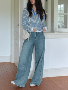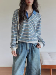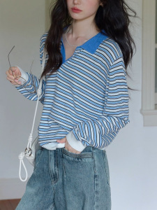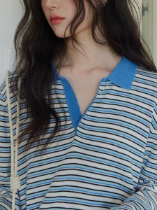 1313撞色polo翻领蓝白条套头羊毛针织衫2025女秋层次感宽松薄毛衣