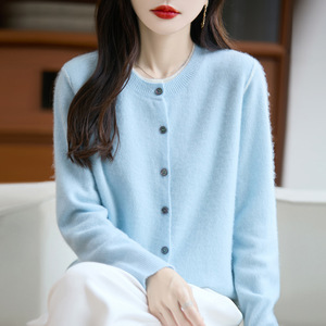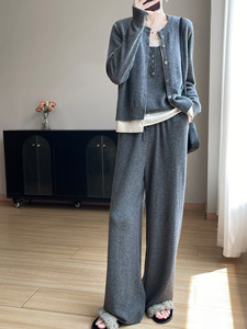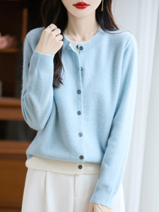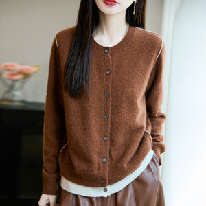 韩系复古圆领拼接假两件针织开衫女早秋纯羊毛气质毛衣外套上衣