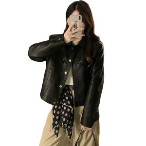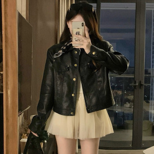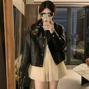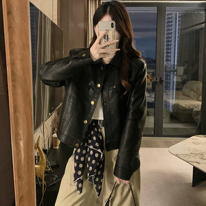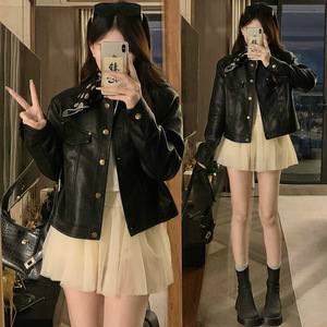 黑色皮衣中短款翻领外套高级感铆钉休闲上衣潮宽松显瘦皮外套