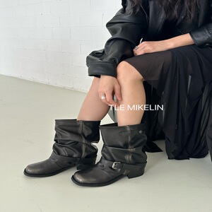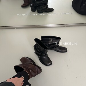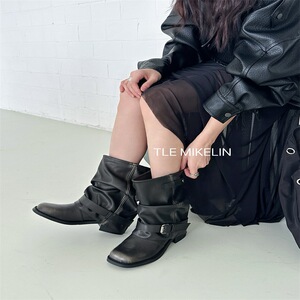巨好看短靴裤管靴超堆堆西部牛仔靴女褶皱黑色圆头覆古骑士靴女