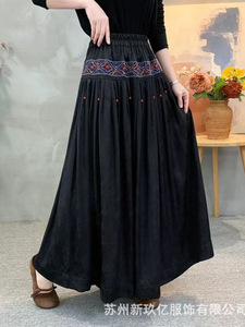 2025文艺气质重工刺绣半身裙女民族风复古提花缎面宽松纯色大摆裙