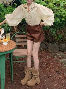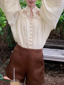 SourceWithU 刘亦菲同款 苎麻镂空刺绣高质感棉麻长袖衬衫上衣