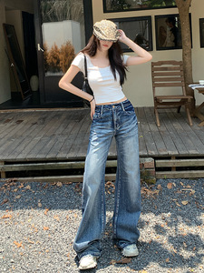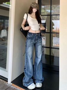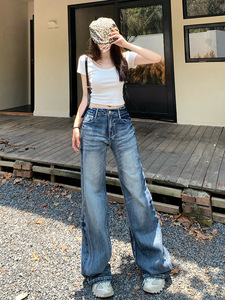 美式复古阔腿牛仔裤女秋季新款高腰水洗宽松不贴腿直筒微喇拖地裤
