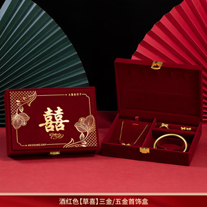 烫金酒红草囍【三金五金首饰盒】+手提袋