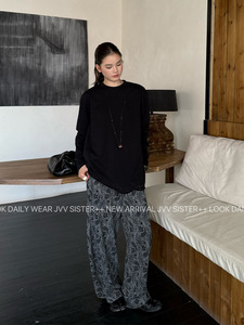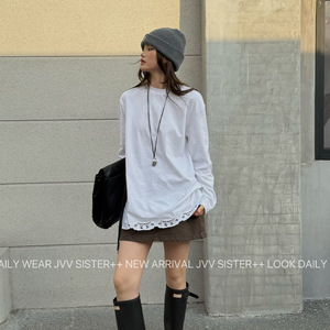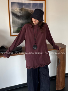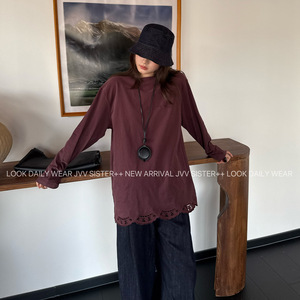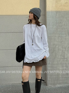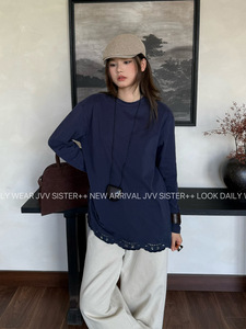 JVV十三行2025秋季新款圆领长袖下摆绣花宽松上衣休闲T恤女71306