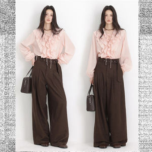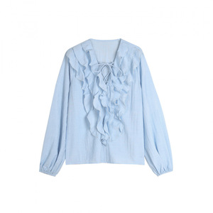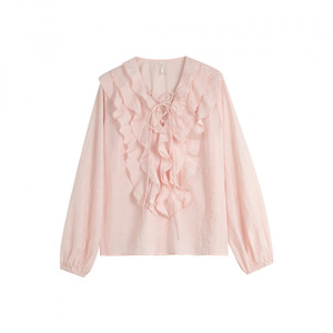 法式时髦气质粉色荷叶边系带上衣女早秋款高级感休闲长袖V领衬衫