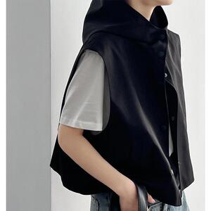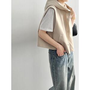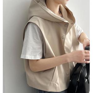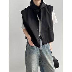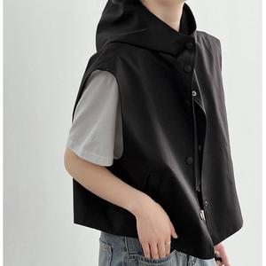 黑色连帽马甲女春秋宽松休闲短款背心外套叠穿小个子坎肩无袖上衣
