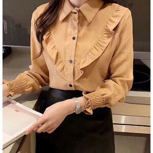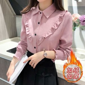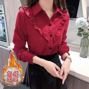 加绒加厚红色秋冬新款灯笼袖时尚长袖衬衫女宽松内搭衬衣外套保