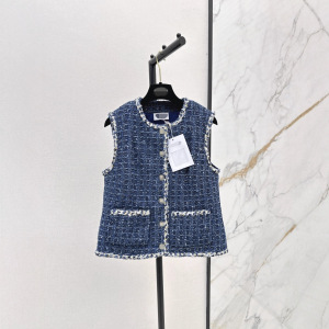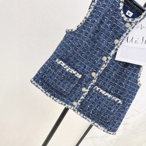 深圳南油新款25法式名媛风粗花呢编织撞色格纹圆领单排扣无袖马甲