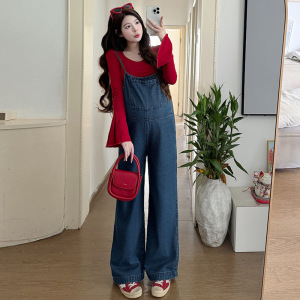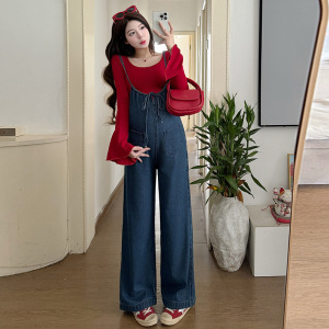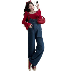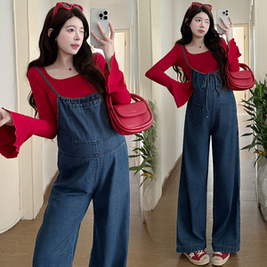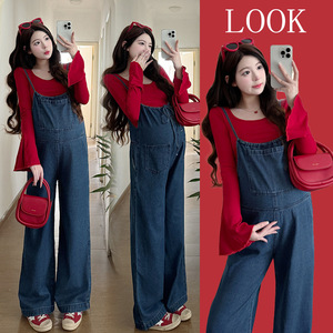 2025秋季新款孕妇装前后两穿孕妇背带裤+红色喇叭袖上衣孕妇套装