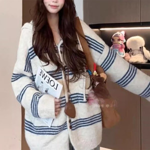 2025秋季时尚减龄宽松连帽针织开慵懒风撞色条纹长袖毛衣外套女