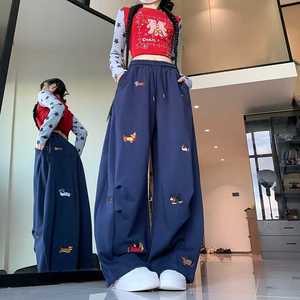 2025韩版美式腊肠狗刺绣弯刀卫裤女宽松慵懒风垂坠感阔腿休闲裤子