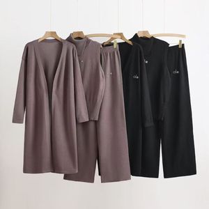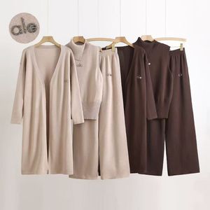 跨境新款气质高级长款针织开衫高领内搭背心松紧腰阔腿裤三件套