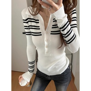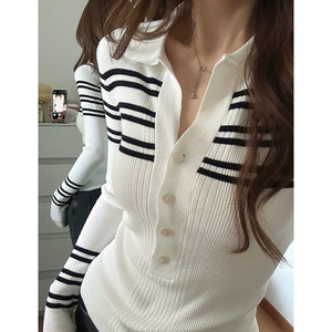 别致撞色条纹针织衫长袖女秋季法式通勤风纽扣Polo领修身打底上衣